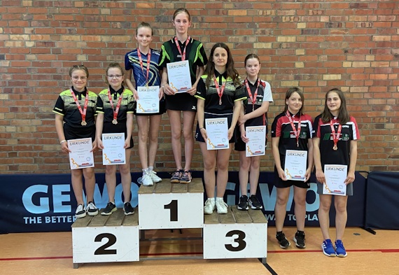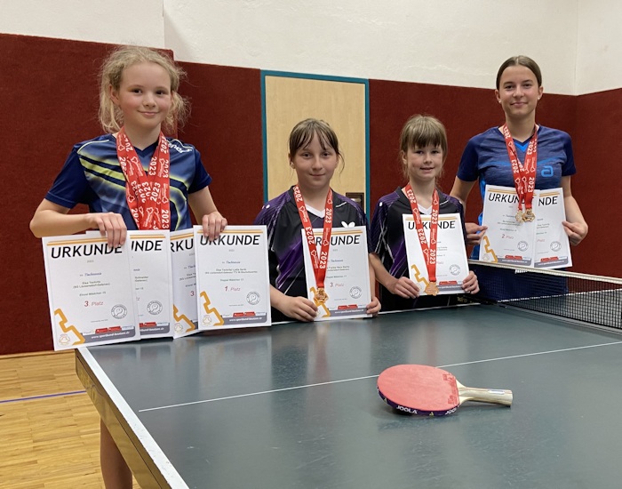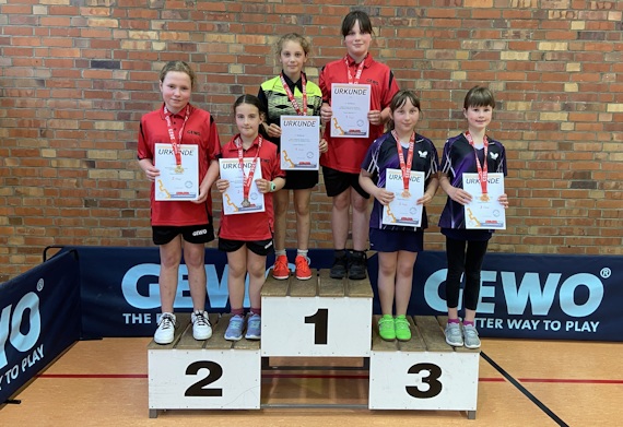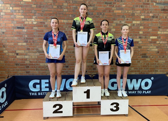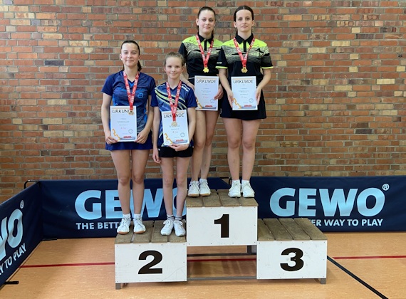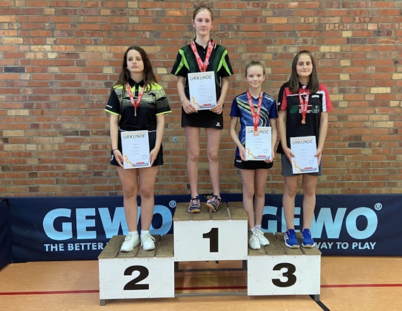 Doppel Mädchen 11 - Emma und Mara können sich über ihre erste Medaille freuen Bei den Jüngsten, der Jugend 11, starteten Mara Starke und Emma Franke bei den Mädchen sowie Mico Starke und Nic Hommel bei den Jungen. Drei von ihnen trainieren erst seit einigen Monaten regelmäßig wodurch teils noch etwas Lehrgeld gezahlt werden musste. Vor allem die Jungen hatten einen schweren Stand in der sehr guten Konkurrenz, aber blieben nicht ohne Satzgewinn. Im Doppel schieden sie hauchdünn mit 2:3 im Viertelfinale aus und verpassten nur knapp eine Medaille. Besser lief es für die Mädchen. Emma konnte sich sogar über einen Einzelsieg freuen. Diesen verpasste Mara nur knapp. Im Doppel spielten die beiden gut zusammen, gewannen gleich ihre erste Partie mit 3:1 und konnten sich am Ende über den Gewinn der Bronzemedaille freuen.