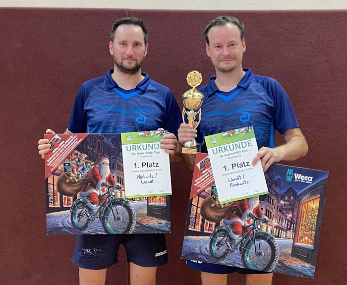 Silvio und Patrick gewinnen nach ca. 8 Stunden Spielzeit den Kubschütz-Cup 2023 Die Vorrunde konnte souverän mit 5:0 Spielen und einer makellosen 15:0 Differenz siegreich beendet werden. Damit gab's im Viertelfinale ein Freilos. Im Halbfinale ging es bereits gegen die an Position 2 gesetzte Paarung vom Gastgeber SV Kubschütz, da diese eine ihrer Vorrundenpartien mit 1:2 verloren. Nach dem erwarteten 1:1 Zwischenstand, musste das Doppel entscheiden. Hier konnten unsere Landesligaakteure ihre Favoritenstellung bestätigen, siegten klar mit 3:0 und zogen verdient ins Finale ein. Mit dem TSV Herwigsdorf warteten hier die nächsten Spieler aus der 1. Bezirksliga. Silvio und Patrick zeigten in beiden Einzeln solide Leistungen und konnten den Tisch als Sieger verlassen. Damit musste kein Doppel mehr gespielt werden und der Turniersieg stand fest. Herzlichen Glückwunsch dazu.