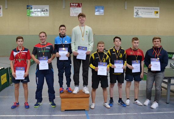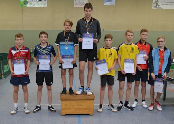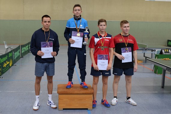 Einzel Jungen 18 - Souveräner Titelgewinn für Rick Im Einzel sollten sich unsere beiden Akteure ebenfalls bis ganz nach vorn spielen. Nach der Gruppenphase sah es auch noch ganz danach aus. Etwas überraschend musste sich Martin dann aber im Viertelfinale Benjamin Stenzel (TTG 64 Boxberg) mit 1:3 beugen. Rick ließ während dem ganzen Turnierverlauf keine Zweifel an seiner Ausnahmestellung aufkommen und gewann sowohl die drei Gruppenspiele als auch die drei Endrundenspiele deutlich.