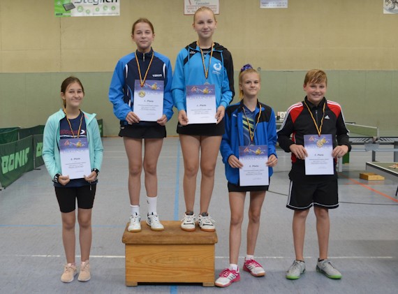 Einzel Mädchen 15 - Mia erkämpft die Bronzemedaille Die Mädchen 15 spielten in einer 5er Gruppe "Jede gegen jede". Hier konnte sich Mia mit zwei Siegen den 3. Platz erkämpfen. Jedoch muss man festhalten, dass der 2. Platz locker drin gewesen wäre. Selina hielt sehr gut gegen und kam sogar zwei mal in den Entscheidungssatz, wo dann nur ein Quäntchen Glück zum Erfolg fehlte.