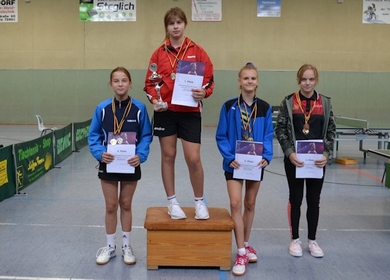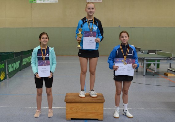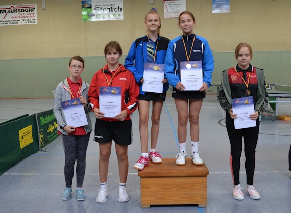 Einzel Mädchen 15 - Silber für Mia, Selina erkämpft Bronze Im Einzel lief es anfangs auch ganz nach Plan. Mia setzte sich in ihrer Gruppe mühelos mit 3:0 Spielen und 9:0 Sätzen durch. Selina gewann zwei Spiele und musste sich nur der Turnierfavoritin beugen. Das Erreichen des Halbfinales und dem Gewinn der Bronzemedaille ist für Selina aber eine sehr gute Leistung. Im internen Duell setzte sich Mia klar durch und traf dann auf Lena Oschütz (TTC Neusalza-Spremberg). Leider wollte es hier diesmal so gar nicht laufen wodurch sie sich mit dem 2. Platz begnügen musste.