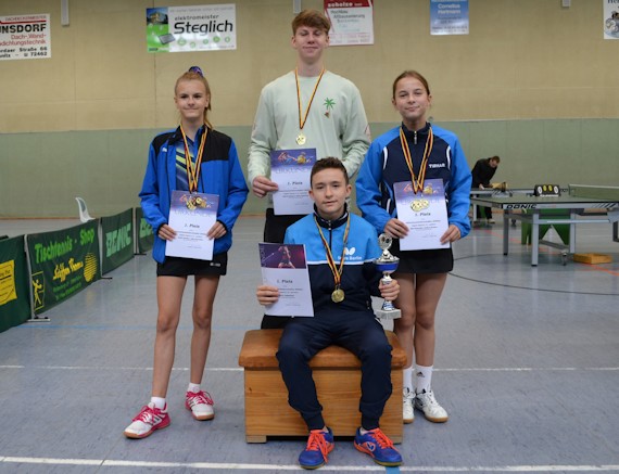 Doppel Mädchen 15 - Mia gewinnt Gold mit Lene, Selina holt mit Florian als Mix-Paarung Bronze Im Doppel gab es dann keine Überraschungen. Mia spielte mit Lene Zahn (SV Horken Kittlitz) und die beiden ließen als topgesetzte Paarung und zwei klaren 3:0 Siegen nichts anbrennen. Selina spielte als Mix-Paarung mit Florian Wechler (SV Horken Kittlitz) und die beiden gewannen die Bronzemedaille.