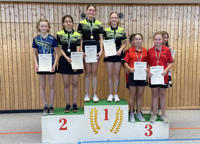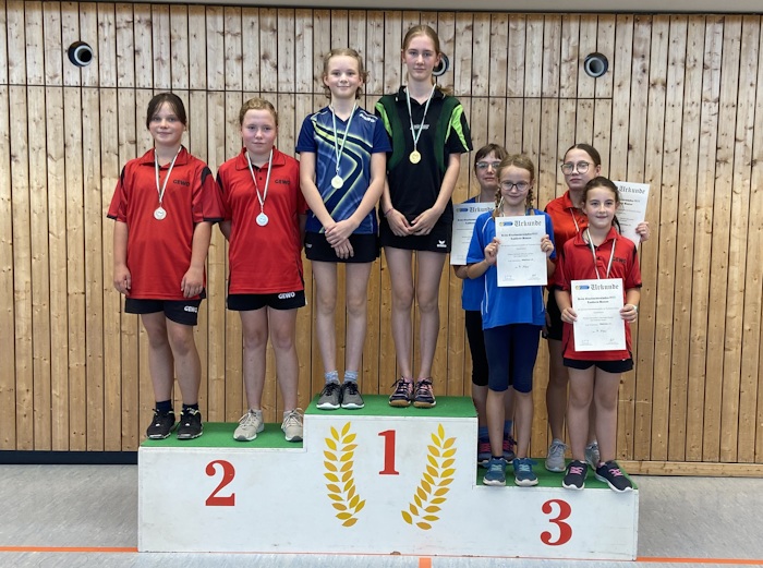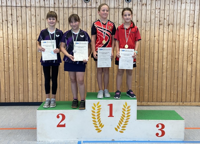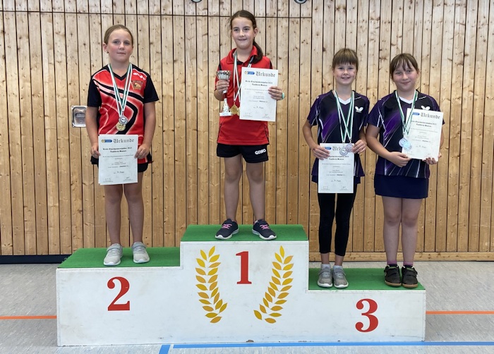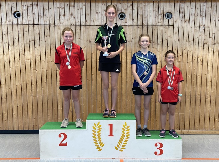 Einzel Mädchen 11 - Mara und Emma teilen sich den 3. Platz und Bronze Im Einzel wurde im System "Jede gegen jede" gespielt. Das interne Duell entschied Emma mit 3:1 für sich. Trotz knapper Sätze sollte es nicht für einen weiteren Erfolg reichen. Mara machte ihr bestes Spiel gegen die spätere Siegerin, gegen die sie alle drei Sätze nur hauchdünn mit zwei Punkten Differenz verlor. Am Ende konnten sich Mara und Emma über Bronze im Einzel freuen.