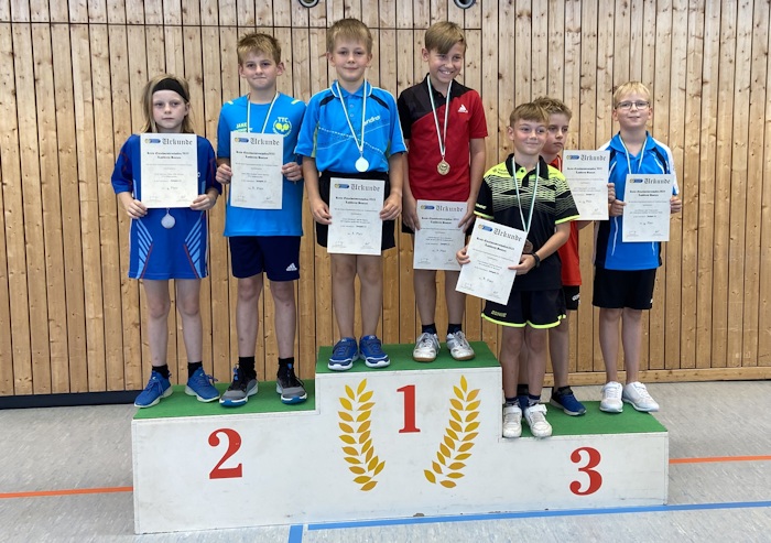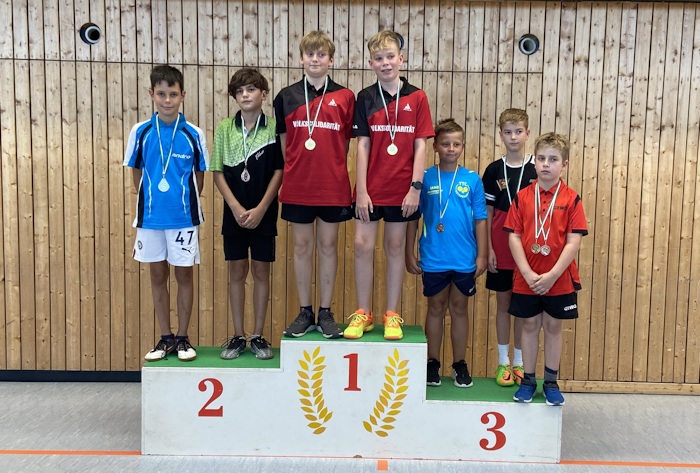 Doppel Jungen 11 - Leo gewinnt mit seinem Partner aus Wiednitz die Bronzemedaille Auch wenn Leo erst seit ca. 4 Wochen regelmäßig beim Tischtennis ist, zeigte er jedoch schnell sehr gute Ansätze, wodurch eine Teilnahme bei der Kreismeisterschaft durchaus Sinn machen sollte. Im Einzel konnte er mit knappen Ergebnissen gut mithalten, auch wenn es noch nicht zu einem Sieg reichte. Im Doppel sollte sich die Teilnahme auszahlen und die Freude war groß, als es für Leo und seinem Partner aus Wiednitz die Bronzemedaille gab.