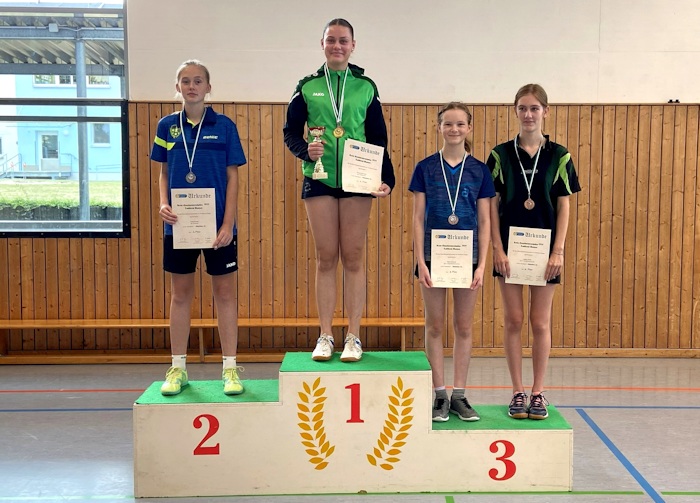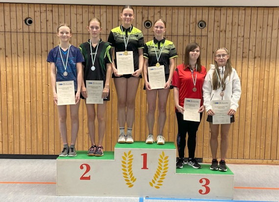 Einzel Mädchen 19 - Elsa kann sich über die Bronzemedaille freuen Bei den Mädchen 19 gab es lediglich drei Paarungen. Elsa spielte wieder mit Lydia Gerth aus Bischofswerda und konnte am Ende Silber erkämpfen. Im Einzel musste Elsa gegen alle weiteren 6 Starterinnen antreten. Die machbaren Aufgaben meistere sie mit drei Siegen und nur einem Satzverlust, was letztlich für die Bronzemedaille reichte.