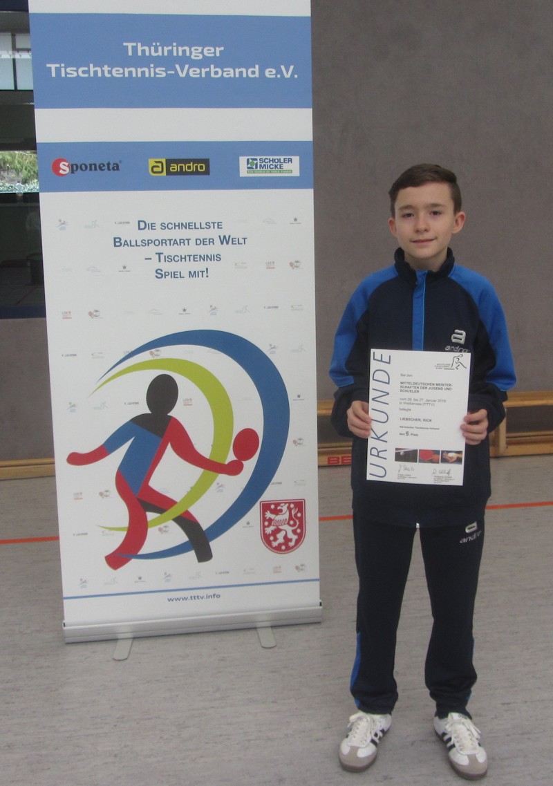 | Für unser Nachwuchstalent Rick Liebscher begann das neue Wettkampfjahr gleich mit einem echten Highlight. Nach sehr guten Ergebnissen bei den Landesmeisterschaften startete er am 26./27. Januar bei der Mitteldeutschen Meisterschaft der Schüler U15 im thüringischen Weißensee bei Sömmerda, bei der er unsere Sektion Tischtennis hervorragend vertrat.