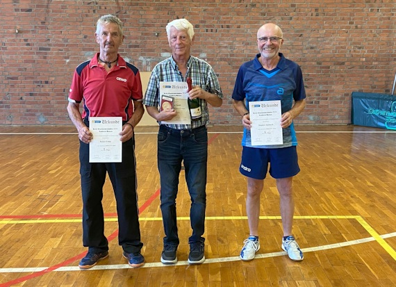 Einzel Senioren 65 - Andreas ist Vize-Kreismeister, Achim wird Dritter Das größte Teilnehmerfeld gab es in der Altersklasse 65. Hier wurde anfangs in zwei 4er-Gruppen gespielt. Andreas kam hinter Topfavorit Matern (TTC Hoyerswerda) mit 2:1 Spielen als Zweiter in die Endrunde. Achim gewann all seine drei Vorrundenpartien und traf als Erster nun im Halbfinale auf Andreas, der sich im internen Duell knapp mit 3:1 durchsetzen konnte.