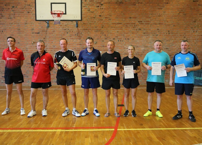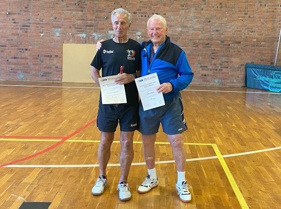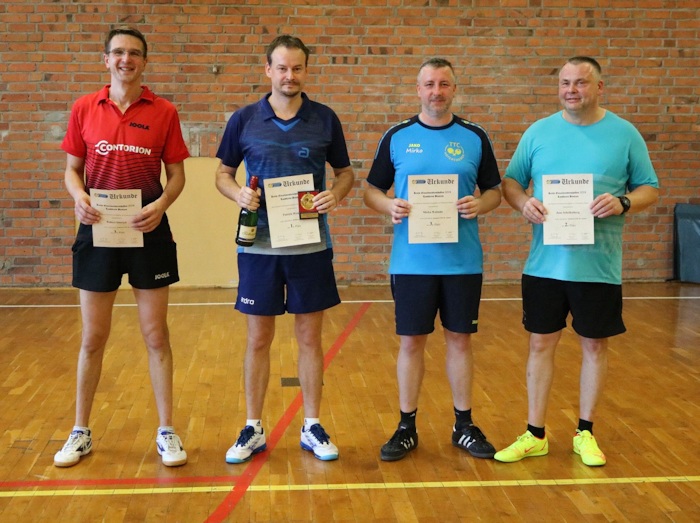 Doppel Senioren 40-85 - Patrick siegte zusammen mit Gerd Golloch vom SV Burkau Bei der Doppelkonkurrenz, die nach den Einzel-Vorrunden gespielt wurde, gab es keine Trennung der Alterklassen. Somit starteten über 20 Paarungen. Andreas und Achim mussten sich im Viertelfinale Wabnitz/Schellenberg mit 1:3 beugen. Patrick spielte zusammen mit unserem ehemaligen Vereins- und Teamkollegen Gerd Golloch vom SV Burkau. Diese Paarung war wenig überraschend nicht zu bezwingen und holte den Doppeltitel.
