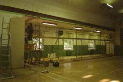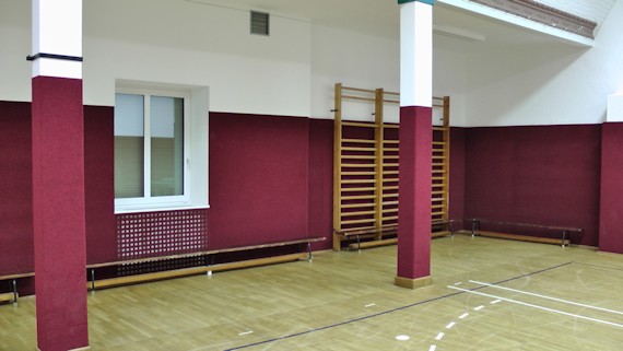 Das nächste größere Projekt stand im August und September 2014 an. Hier wurde im gesamten Innenbereich der Sporthalle eine Prallschutzwand in angenehmer weinroter Farbe angebracht. Außerdem wurden die Schutzgitter an den Fenstern entfernt, neue ballwurfsichere Fenster eingesetzt und elektrisch bedienbare Rollladen verbaut. Hinzu kommt die neue Lüftungsanlage im Dachgeschoss der Sporthalle und das Entfernen der traditionsträchtigen Klinkerwand.
