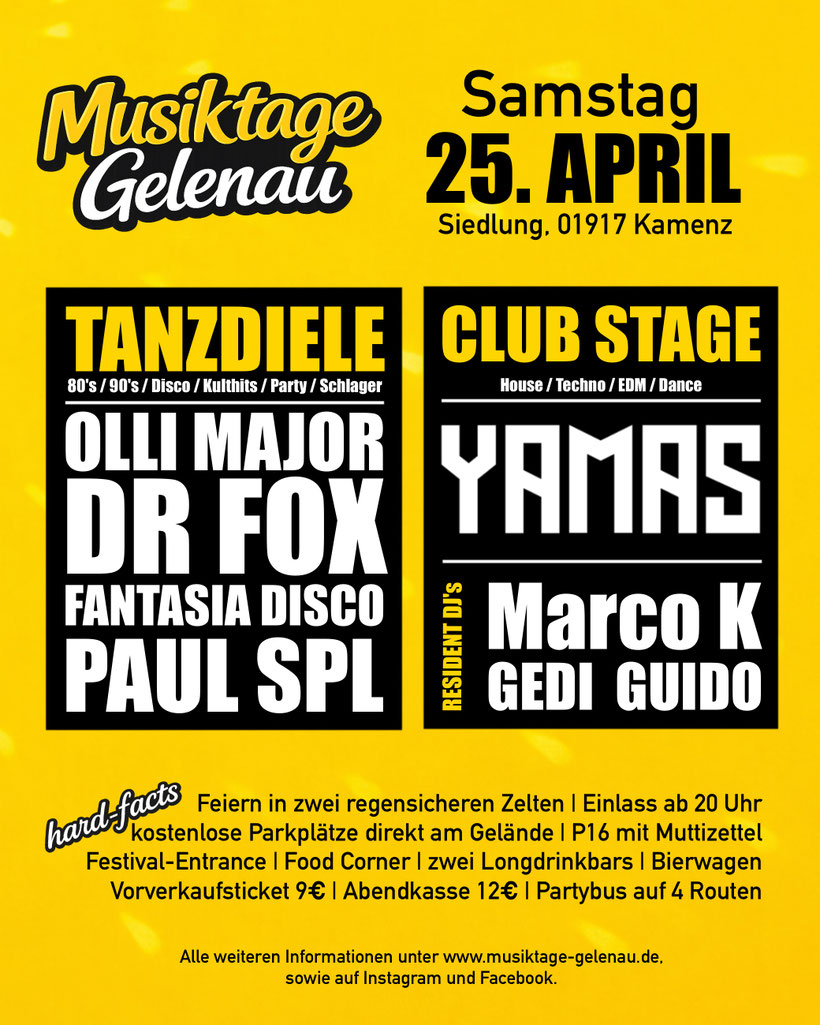 | Vorschau Die Open-Air-Saison 2026 steht in den Startlöchern und beginnt mit den Musiktagen am 25. & 26. April auf dem Sportplatz in Gelenau. Neben den sportlichen Aktivitäten und dem Familienprogramm am Sonntag, steigt am Samstagabend in zwei regensicheren Zelten die große Tanzparty, bei der die verschiedenen Künstler dem Publikum ordentlich einheizen werden. Wir freuen uns auf zahlreiche Besucher. | ||